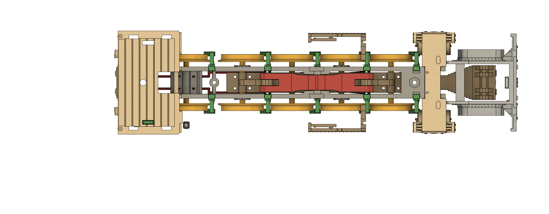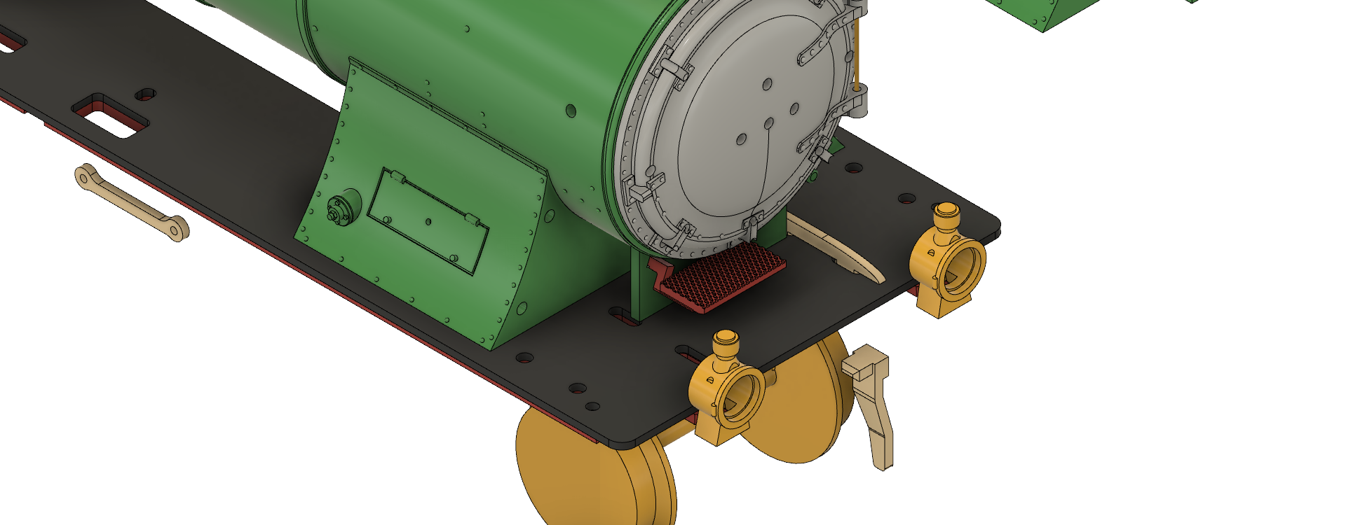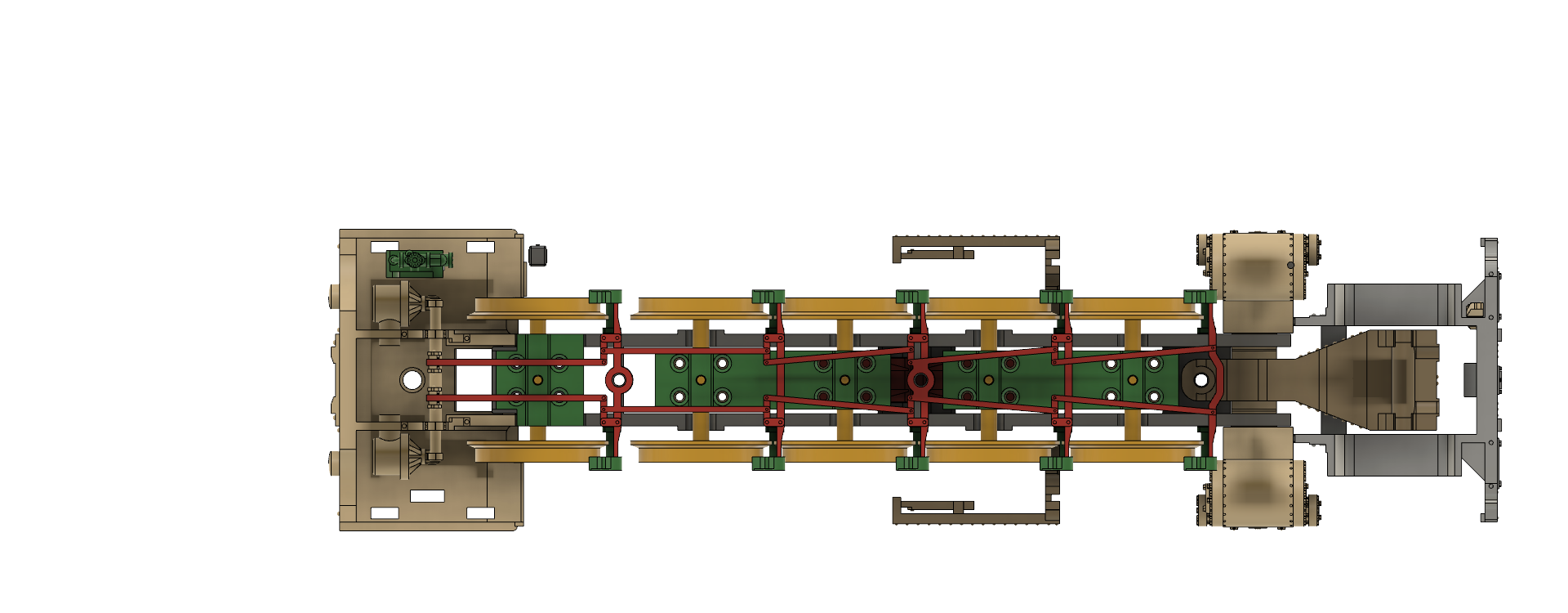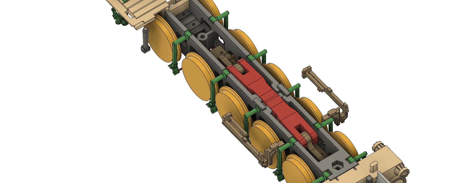 * Das doppelte Wipplager ist fertig geplant. Das dürfte so stabil sein. Recht aufwendig ist die Besfestigung der Bodenplatte: hier sind Schrauben beidseitig der Platte vorgesehen um den Druck auf die Achsen gleichmässig sein zu lassen.
